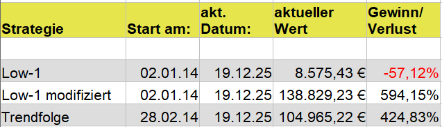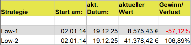 Im Zeitraum zwischen dem Jahresbeginn 2014 und dem 19.12.2025 hat sich der Wert des Low-2 Depots mehr als verdoppelt, während beim Low-1 Depot weniger als die Hälfte der Anfangsinvestition zu Buche steht.