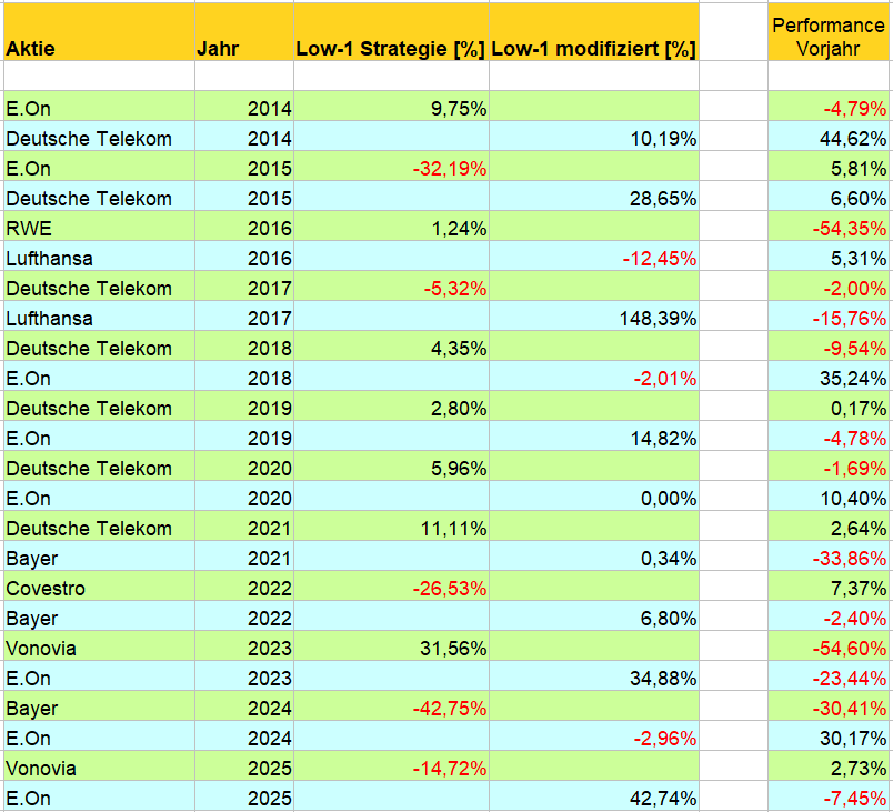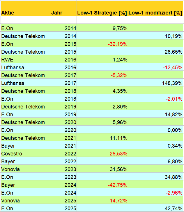 Vergleichen wir dazu erst einmal die jährliche Rendite der Standard- und der modifizierten Low-1-Strategie. Die prozentualen Kursveränderungen sind inklusive Dividende.